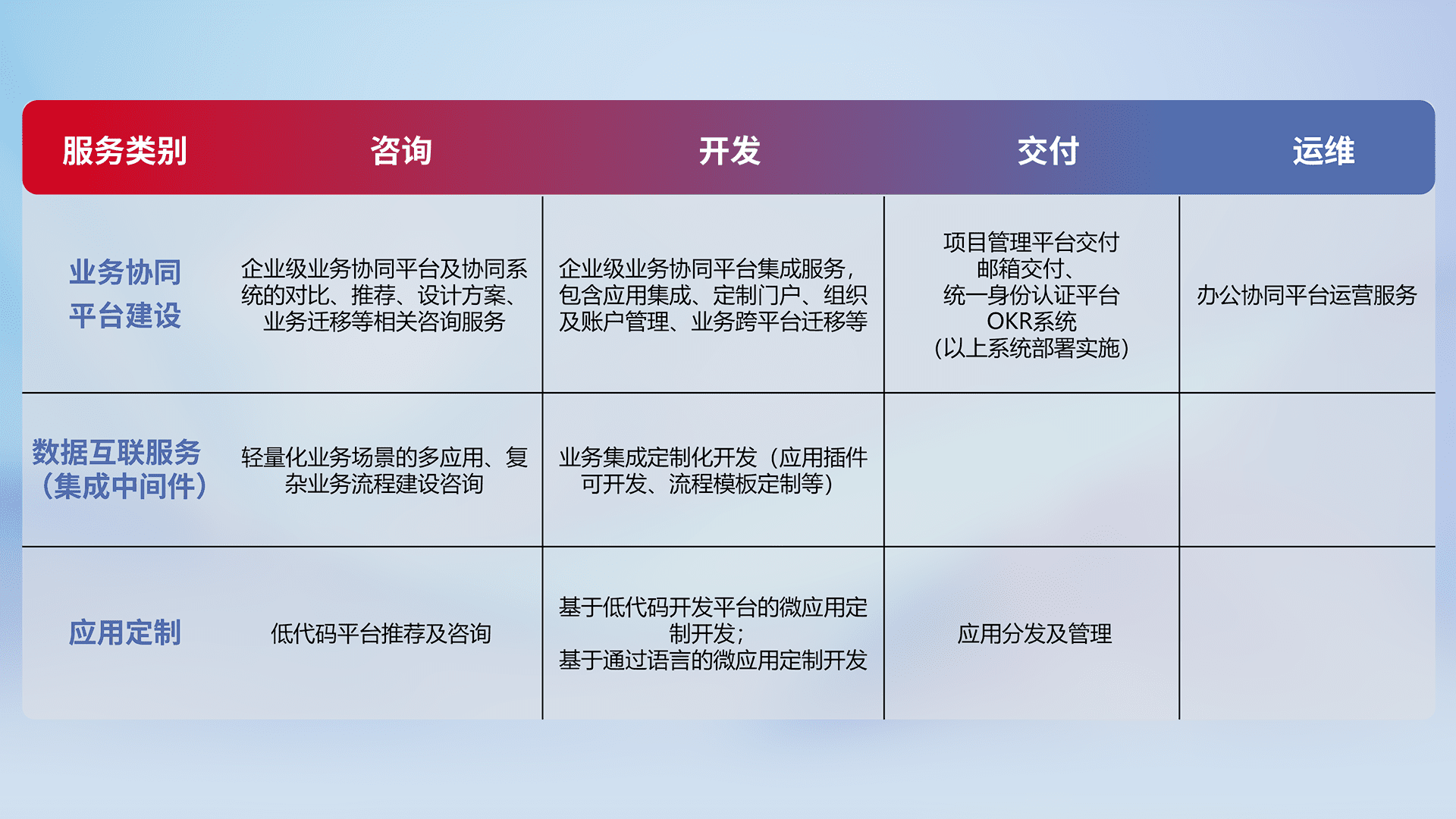 针对钉钉、、、、企微、、IDaas等平台级产品提供产品的规划、、方案、、、交付、、、、定制化开发等服务,,,实现如统一协同办公、、智能客户服务、、、混合会议管理、、、、智能数据查询、、、等业务场景,,,实现数字化转型。。