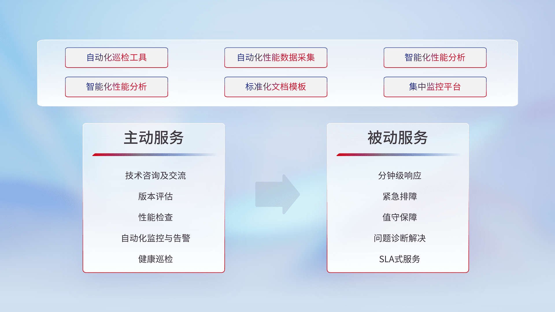 智能化工具和标准化文档,,保障服务质量,,,,提供主动服务(包含技术咨询、、、版本评估、、、、性能检查、、自动化监控与告警、、健康巡检)和被动服务包含(分钟级响应、、紧急排障、、值守保障、、、问题诊断解决、、、SLA服务)。。。